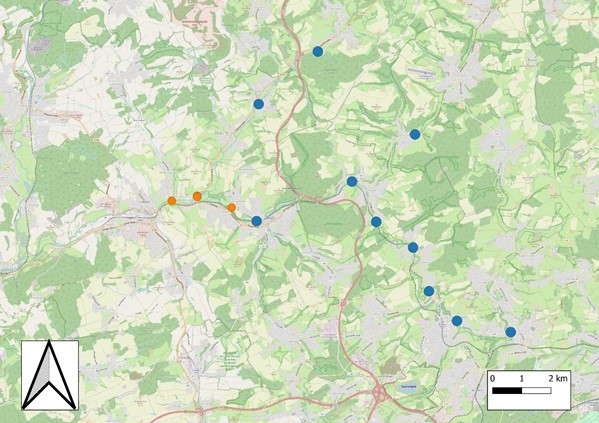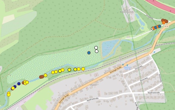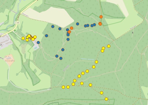 Letztlich wurden in direkter Nähe zu den bisher gereinigten und kontrollierten Nisthilfen 16 weitere Höhlenkästen entlang eines Waldweges gefunden, welche bereits vor längerer Zeit vermutlich von der gleichen lokalen Naturschutzgruppe wie die bereits entdeckten aufgehängt wurden. Diese wurden zwar gereinigt und waren oftmals voller altem Nistmaterial (meist Meisennester, teils Trauerschnäppernester), bei welchem aber unklar war, ob die letzte Brut 2022 oder früher stattfand. Diese „neuen“ alten Kästen werden ab der kommenden Brutzeit mit ins Monitoring und die jährliche Reinigung aufgenommen werden. Diese 16 Höhlenkästen wurden, da sie sich abseits des Monitoringtransekts „Berschweiler Schullandheim“, bis zum Quellbereich des Frankenbachs, befinden (Abb. 3), einem neuen Standort „zwischen Berschweiler und Urexweiler“ (BU) zugeordnet werden (Tab. 2).