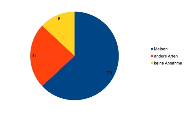 Allgemein kamen Purcell et al. (1997) bei ihrer Auswertung zum Bruterfolg mehrerer nordamerikanischer Vogelarten, welche sowohl in Nistkästen als auch natürlichen Baumhöhlen brüten, zu dem Ergebnis, dass die Nistkästen zwar teils keinen messbaren positiven Effekt im Vergleich zu Bruten in Naturhöhlen hatten. Jedoch schlüpften bei manchen Arten in den Kästen mehr Küken, die früher ausflogen und die Prädationsraten waren hier geringer. Newton (1994) fasste in seiner Literaturauswertung zu Höhlenbrütern zusammen, dass diesen allgemein durch die Erhöhung des Nistplatzangebotes, gerade in eher monotonen Kulturen geholfen werden kann, einerseits durch die Erhöhung des Totholzanteils mit z.B. natürlichen Spechthöhlen und andererseits auch mit künstlichen Nisthilfen. Dass ersteres teils selbst in Schutzgebieten schwierig sein kann, sieht man an unserer Ursprungsidee, weshalb wir Nisthilfen ausbringen: in dicht besiedelten Gebieten könnten viele sturzgefährdete Bäume theoretisch eine Straße oder einen Fußweg treffen, sodass sie oft gefällt werden müssen, bevor sie sich überhaupt zu Biotopbäumen entwickeln können.Von unseren 46 ausgebrachten Höhlenkästen (inklusive Starenkästen, exklusive Waldkauz- und Baumläuferkästen) wurden 40 angenommen (=87%, Abb. 5), von den inzwischen vierzehn ausgebrachten Halbhöhlenkästen jedoch wiederum lediglich zwei (=14%). Vögel können ähnlich zu Fledermäusen (Zahn & Hammer 2017) eine gewisse Zeit benötigen, bis sie Nisthilfen annehmen (Schönfeld & Brauer 1972). Daher werden das kommende Jahr noch weiterhin beide Kastentypen ausgebracht werden. Wenn es sich nach dann drei Jahren bestätigt, dass die Halbhöhlenkästen (aber auch die speziellen Baumläufer- und Waldkauznisthilfen) signifikant weniger angenommen werden als die Höhlenkästen, würde diskutiert werden, in Zukunft nur noch Höhlenkästen auszubringen. So war unter den bereits an dem neuen Standort „Ill-Aue zwischen Urexweiler und Hirzweiler“ ausgebrachten neun Vogelkästen nur noch eine Halbhöhle. Zudem wurden weder die sechs speziellen Nisthilfen für Baumläufer noch der Waldkauzkasten auch im Jahr 2022 angenommen. Diese Kastentypen würden bereits jetzt erst dann wieder neu ausgebracht werden, wenn ein Besatz nachgewiesen würde. In Tab. 2 ist letztlich erkenntlich, dass wenige Kästen (v.a. Halbhöhlen, aber auch Höhlenkästen) in beiden Jahren unbesetzt waren. Sollten diese auch kommendes Jahr unbesetzt bleiben, werden wir sie am Standort umhängen. Der starke Besatz der Höhlenkästen rührte auch dieses Jahr v.a. durch die starke Annahme durch Meisen, meist Kohl- und Blaumeise, her (Abb. 5). Auch in anderen, v.a. Waldgebieten, waren und sind Meisenarten über die Jahre die häufigsten Brüter (z.B. Schönfeld & Brauer 1972, Lühl 2011). Auch wenn fast alle Arten, die bisher von unseren Nisthilfen profitierten, in ihrem Bestand ungefährdet und häufig sind, merken Burns et al. (2021) zurecht an, dass die Wiederherstellung der einst noch höheren Abundanzen der „gewöhnlichen“ europäischen Brutvögel ein wichtiges Ziel bei der Wiederherstellung der avifaunistischen Biodiversität in Europa ist.Die direkte Annahme neu ausgebrachter Höhlenkästen weist auf einen Brutplatzmangel hin, z.B. natürlicher Specht- und Totholzbäume (vgl. Newton 1994). Insgesamt wäre auch zu überlegen, in Zukunft Höhlenkästen an für Höhlenbrüter eher ungeeigneten Standorten, z.B. in relativ jungen Forsten oder in Nadelforsten anzubringen. In Estland hatten Höhlenkästen bei der Kohlmeise die besten Erfolge, wenn diese in monotonen Nadelforsten aufgehängt wurden, welche dadurch erst besiedelt wurden (Mänd et al. 2005). Ob es auch in unserem Gebiet einen klaren Zusammenhang zwischen Umgebung der Kästen, Alter und Kastentyp gibt, wird kommendes Jahr (nach dann drei Jahren Monitoring) ausgewertet werden.