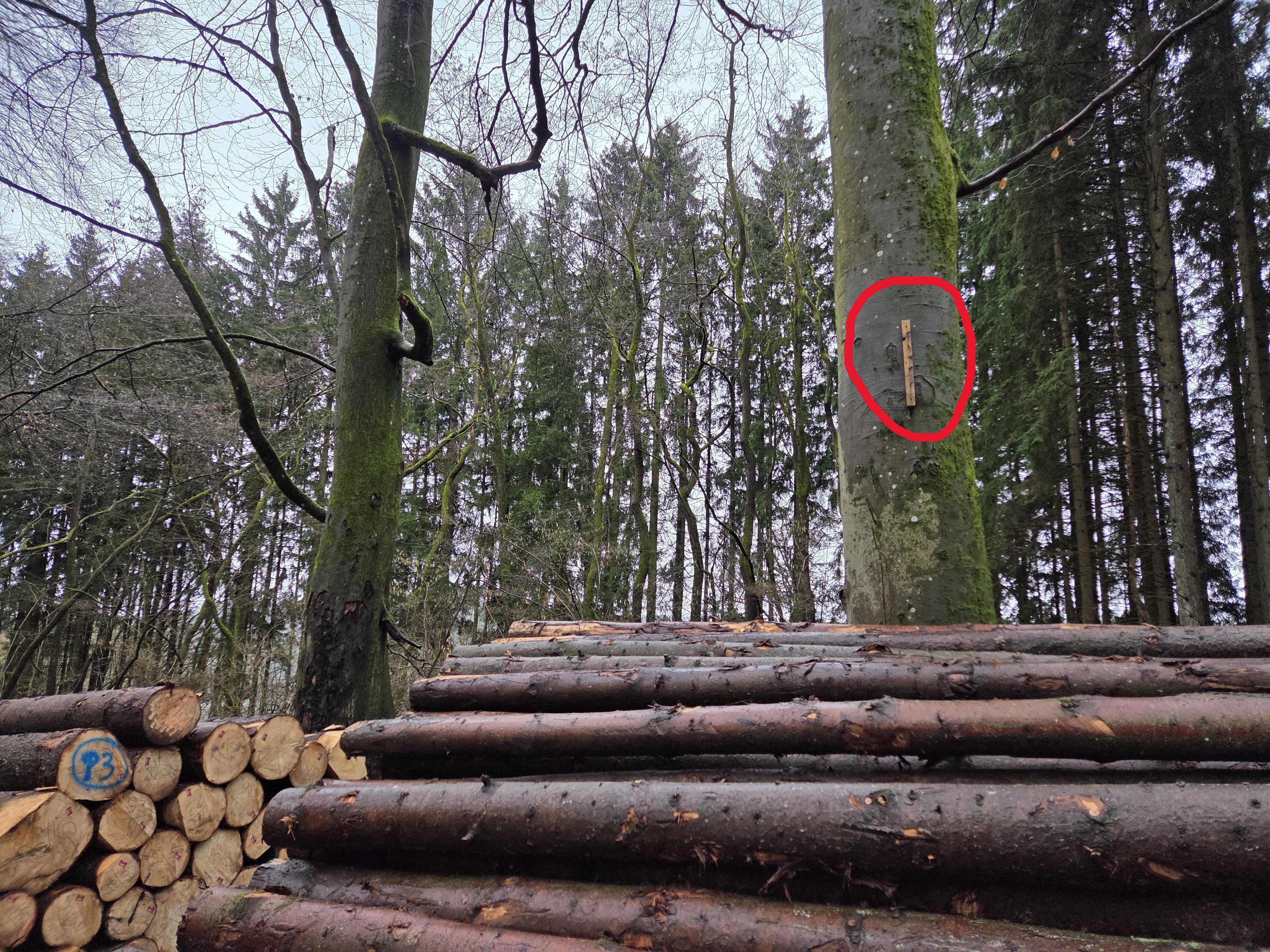 Sechs Nistkästen und drei Fledermausflachkästen gingen verloren und wurden bisher noch nicht ersetzt: Fünf Nistkästen und zwei Flachkästen wurden im Wald hinter dem Schullandheim durch Forstarbeiten zerstört, entweder sind sie mitsamt gefällten Bäumen abtransportiert worden oder aber die Nistkästen waren zerstört. Im Falle eines Flachkastens war es das zweite Jahr in Folge, dass Fichtenholz gegen die Stämme zweier alter Buchen gelagert wird und in diesem Zuge der Flachkasten abgerissen wurde (Abb. 1). Zudem waren am Bruchelsbach ein Flachkasten und eine Baumläufernisthilfe vollständig verfault und wurden entfernt.