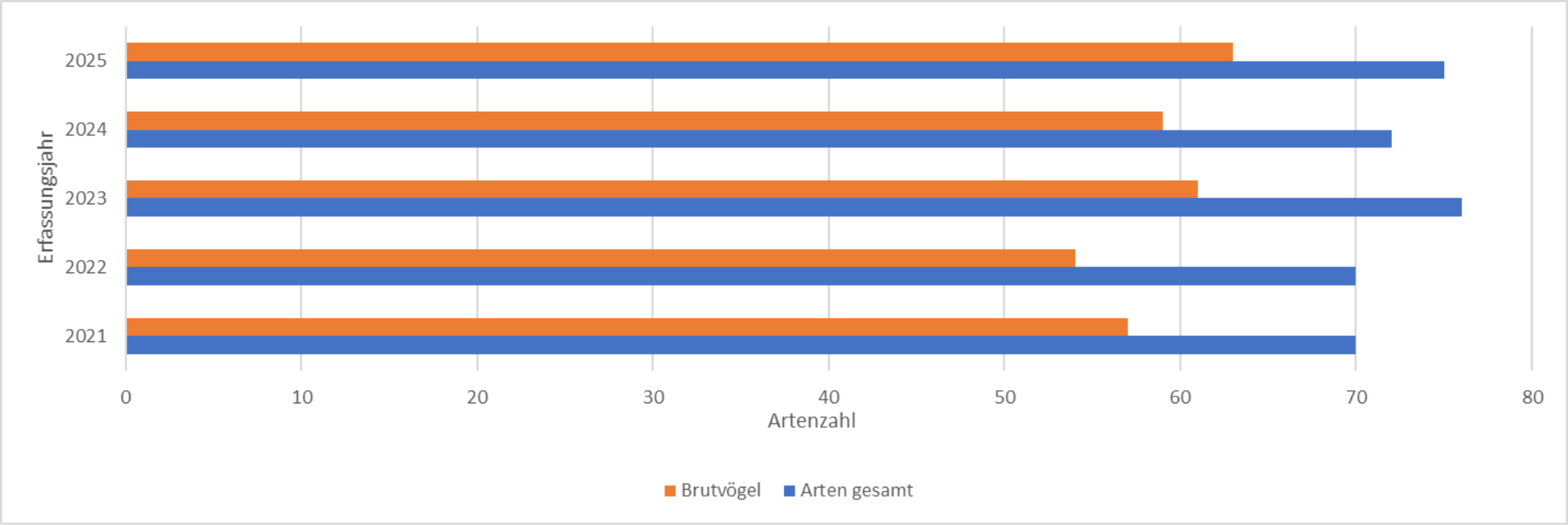 | Artenzahl 2021 | Artenzahl 2022 | Artenzahl 2023 | Artenzahl 2024 | Artenzahl 2025 | Brutvögel 2021 | Brutvögel 2022 | Brutvögel 2023 | Brutvögel 2024 | Brutvögel 2025 |