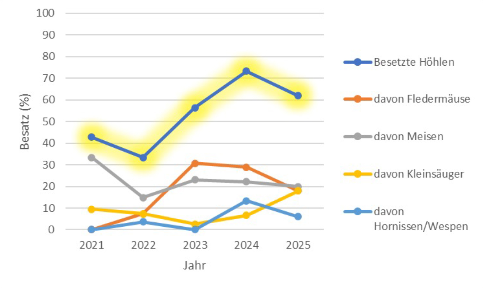 Schaut man sich den Besatz der Fledermaushöhlen seit 2021 an, sieht man, dass dieser von ca. 30-40% auf 60-70% gestiegen ist. Trotz leichter Schwankungen sind ca. 20-30% tatsächlich von Fledermäusen besetzt, die übrigen von Meisen, Kleinsäugern, Hornissen oder Wespen (Abb. 4).
