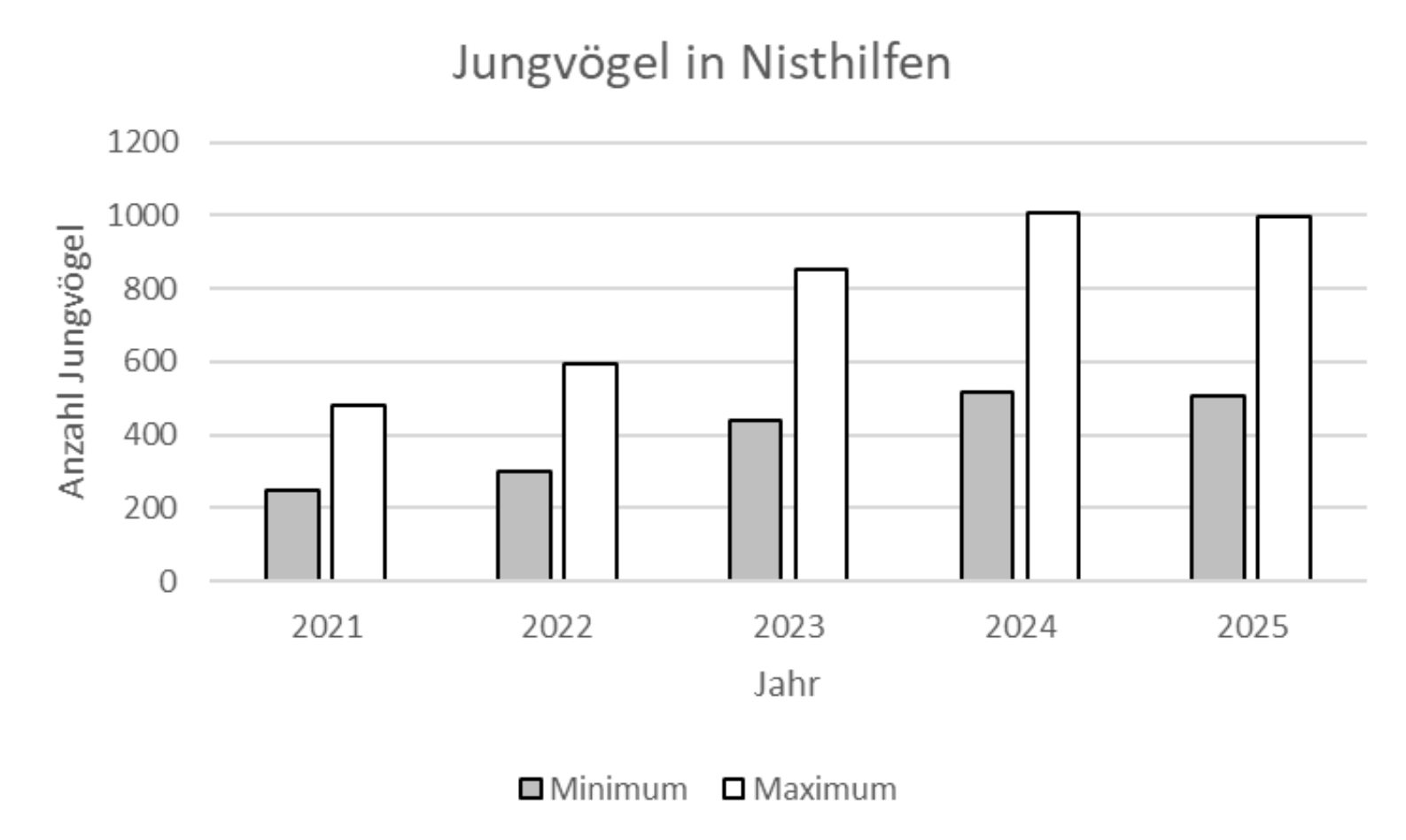 Abb. 6: Geschätzte minimale und maximale Anzahl an Jungvögeln, die 2021-2025 unsere Nisthilfen verließen.