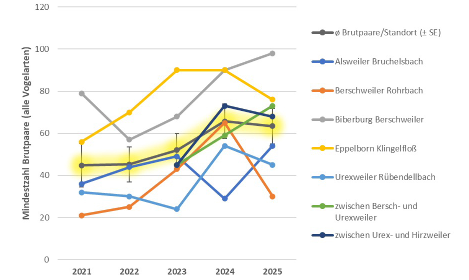 Am Rohrbach bei Berschweiler wurde 2025 nur eine Brutzeitbegehung durchgeführt und daher weniger Arten als in den Vorjahren nachgewiesen; für das Jahr 2025 müssen die Daten als nicht repräsentativ gelten.