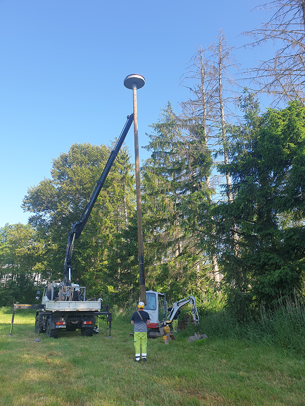 Durch den Erfolg im benachbarten Aschbach motiviert, wurde von uns auf Initiative von Reinhold Morsch, welcher in diesem Gebiet regelmäßig Weißstörche bei der Nahrungssuche beobachtet, ein weiterer Storchenhorst am Rand einer Auwiesen an der Theel hinter der Mühlenstraße in Thalexweiler gestellt. Wir gaben nochmals die Fertigung einer Metallplattform (Fa. Stahlbau Gross) in Auftrag und kauften ein geflochtenes Weidennest der Fa. Schwegler. Die energis spendete nochmals den Holzmast und die Fa. OMEXOM stellte diesen nochmals ehrenamtlich. Auch half unser Arbeitstrupp der NAS, indem die Metallplattform und das Nest pünktlich zur Stellung angeliefert wurden. Weiterer Dank gilt der Grundstückseigentümerin Frau Groß und dem Bewirtschafter, welche mit der Stellung einverstanden waren. Der Standort ist randlich so gewählt, dass er keine Probleme bei der Heumahd verursacht, direkt vor einer Gruppe abgestorbener Fichten, welche jetzt im Winterhalbjahr entfern werden, sodass er völlig „anflugfrei“ stehen wird.