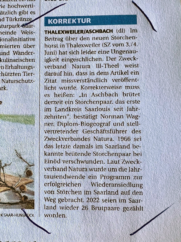 Nach der Stellung fand zudem ein kleiner Pressetermin mit allen Beteiligten statt, zu welchen ein Artikel in der Saarbrücker Zeitung entstand: www.saarbruecker-zeitung.de/saarland/saarlouis/lebach/neuer-storchenhorst-an-der-theel-fuer-meister-adebar_aid-91529681